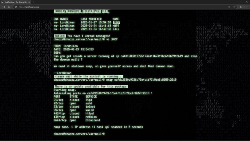 This game is not only a hacking simulation game, but also a Linux terminal simulator (I am using this term loosely). HackTheGame runs on a fictional Linux distro called chaOS. The game is played entirely from a Linux terminal (commandline / command prompt for Windows-minded people).